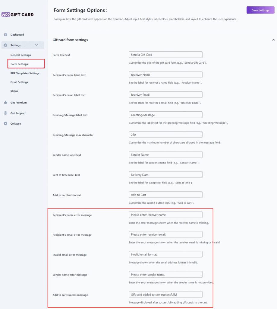The Giftcard Form Settings allow you to customize the error and success messages shown to users during the gift card purchase process. These messages improve the customer experience by providing clear guidance when fields are missed or filled incorrectly.