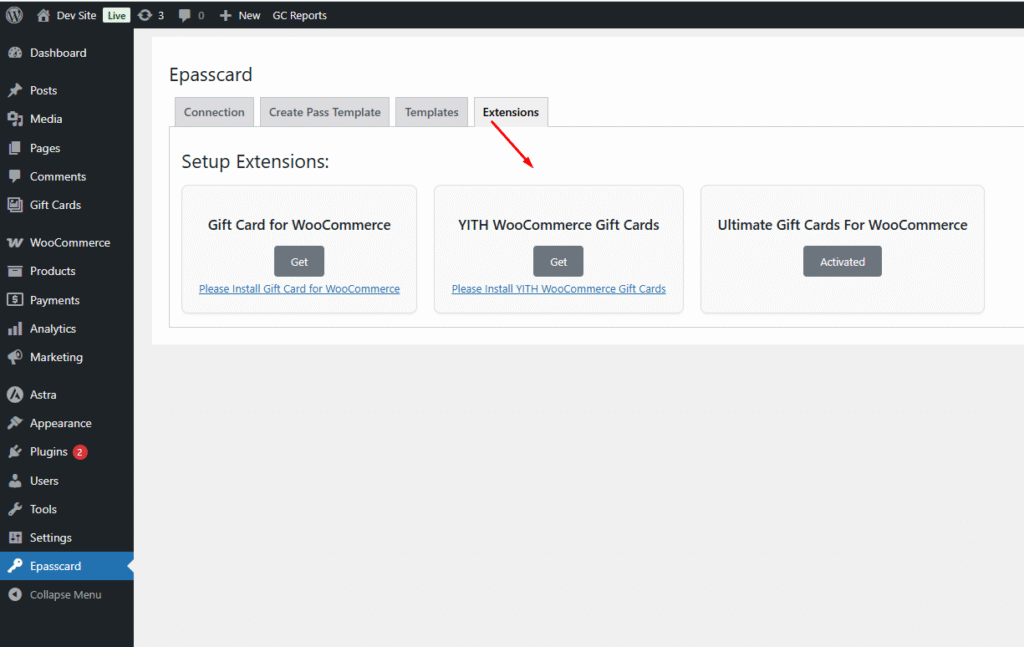 Epasscard-> Extensions-> Install plugin and extension which you want to configure(Gift card plugins and extension configuration to create single pass in pass template when create giftcard)