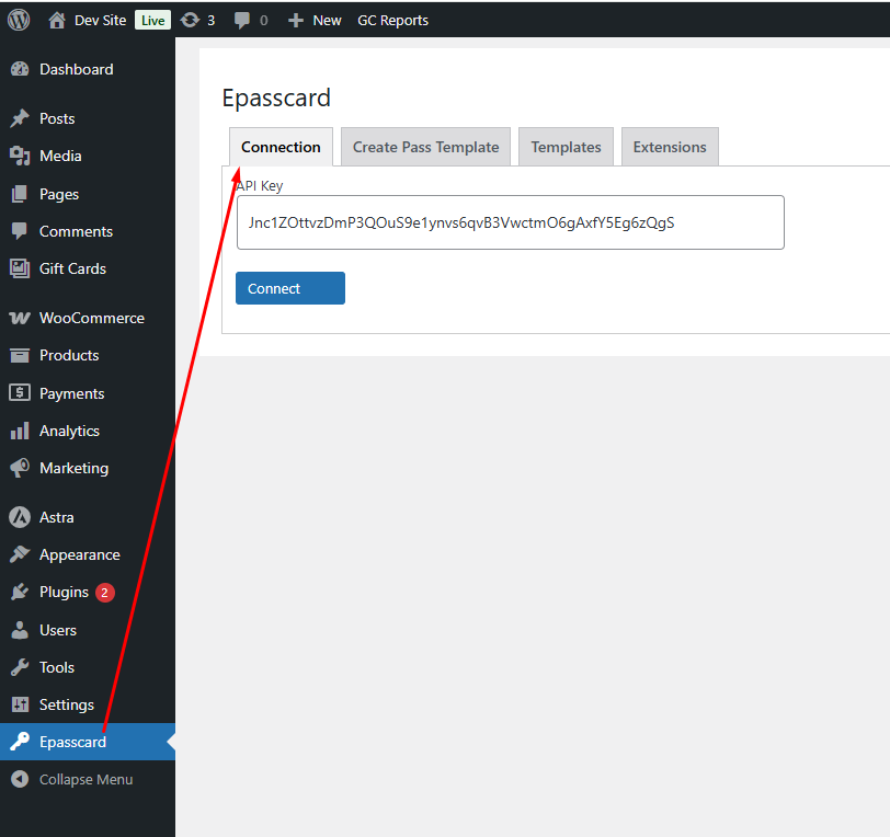 - Visit Epasscard -> Connection tab -> insert API Key -> Connect