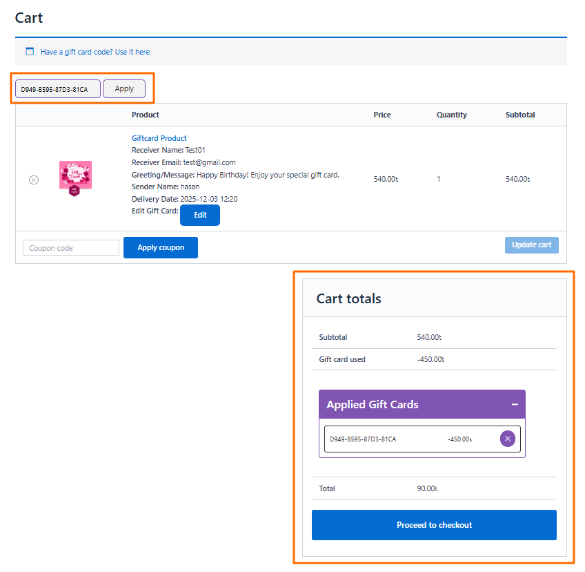The Apply Giftcards Code block allows customers to redeem their gift card codes directly on the Cart or Checkout page. Once applied, the gift card balance is validated, and the discount is applied to the order total.