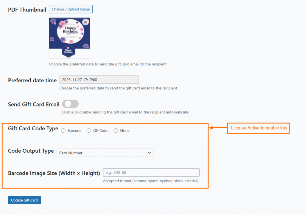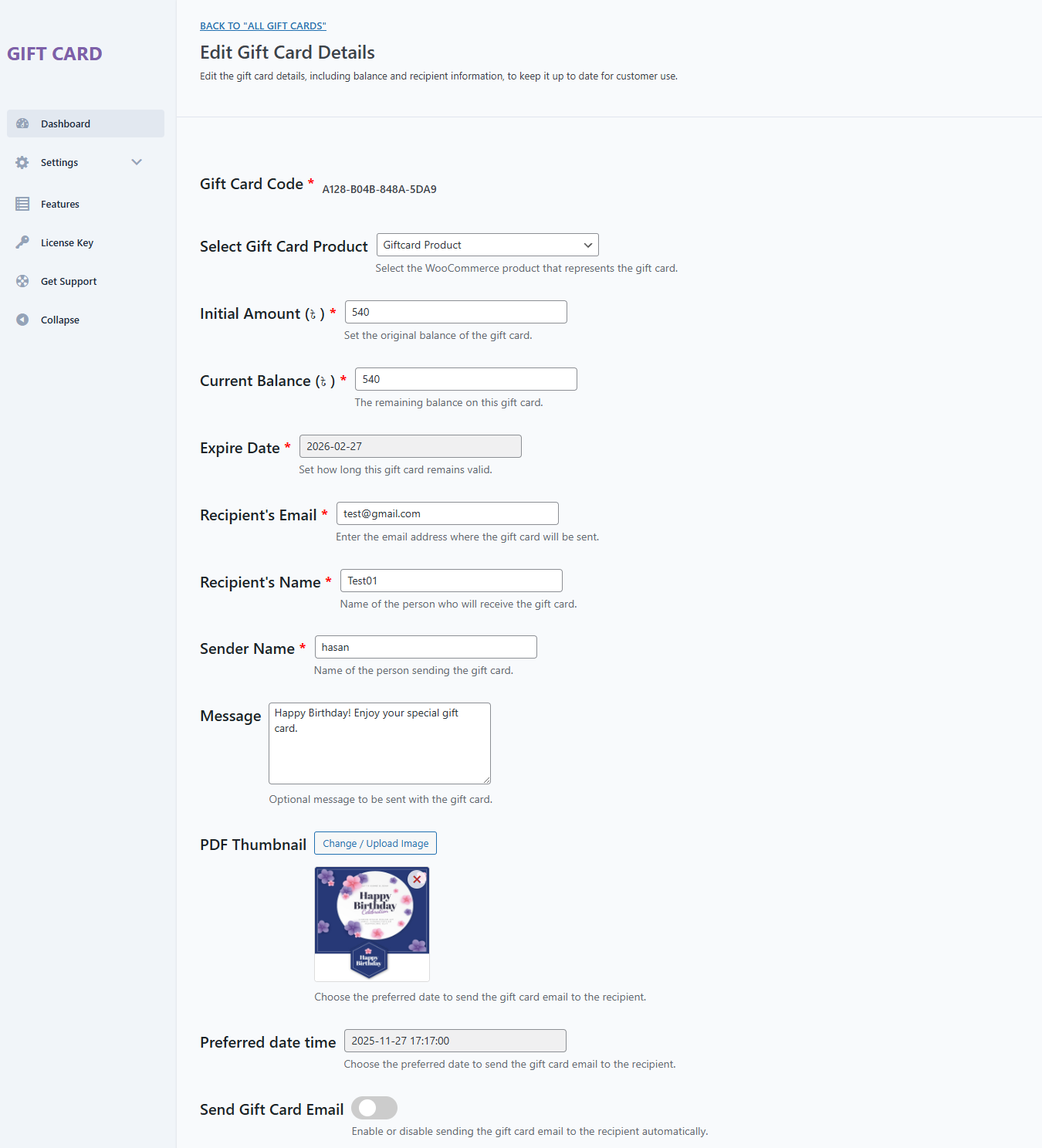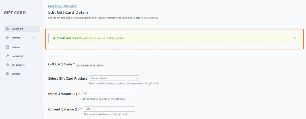 Update the gift card information and click the Update Gift Card button to apply your changes.