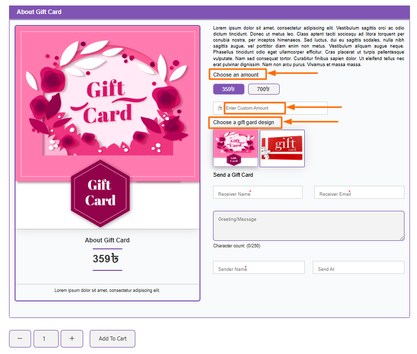 Show a summary section on the gift card product descriptions text. That includes sender and receiver details. This makes it easier to identify who sent the gift and who it’s for.