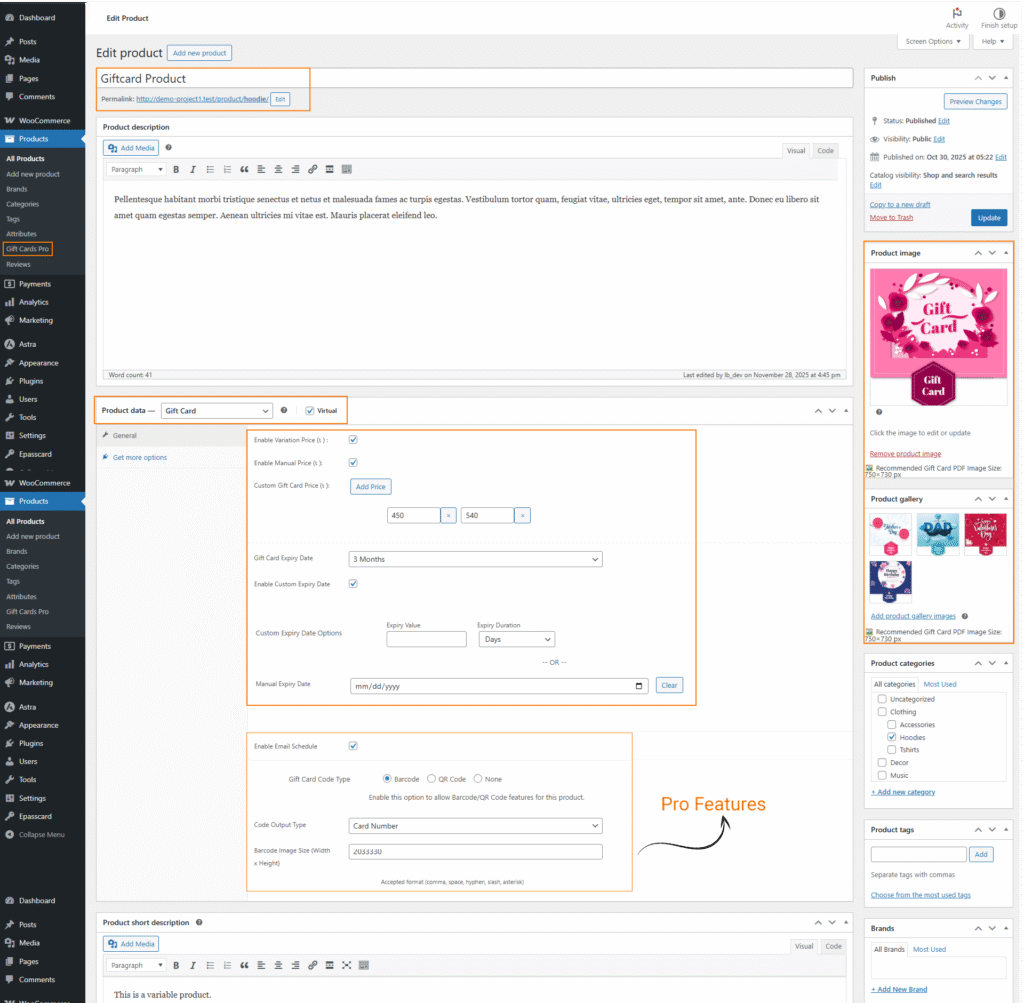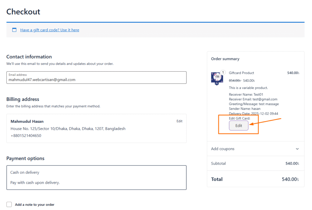 This option allows customers to edit their gift card details directly from the checkout page — available only in the PRO version and requires an active license.