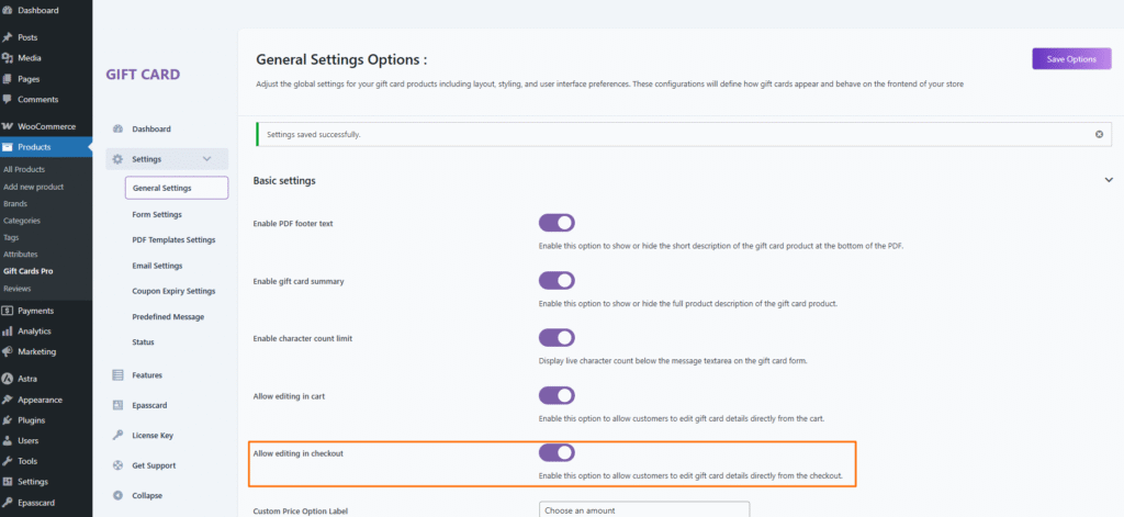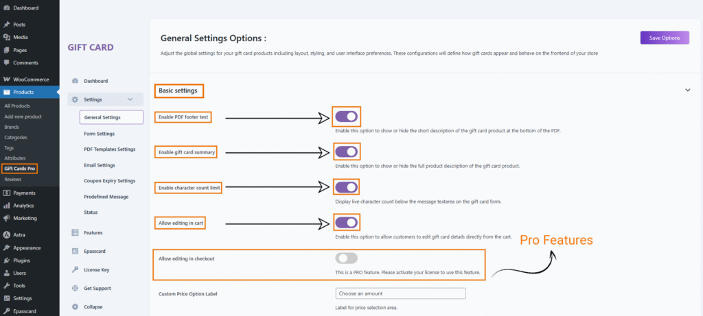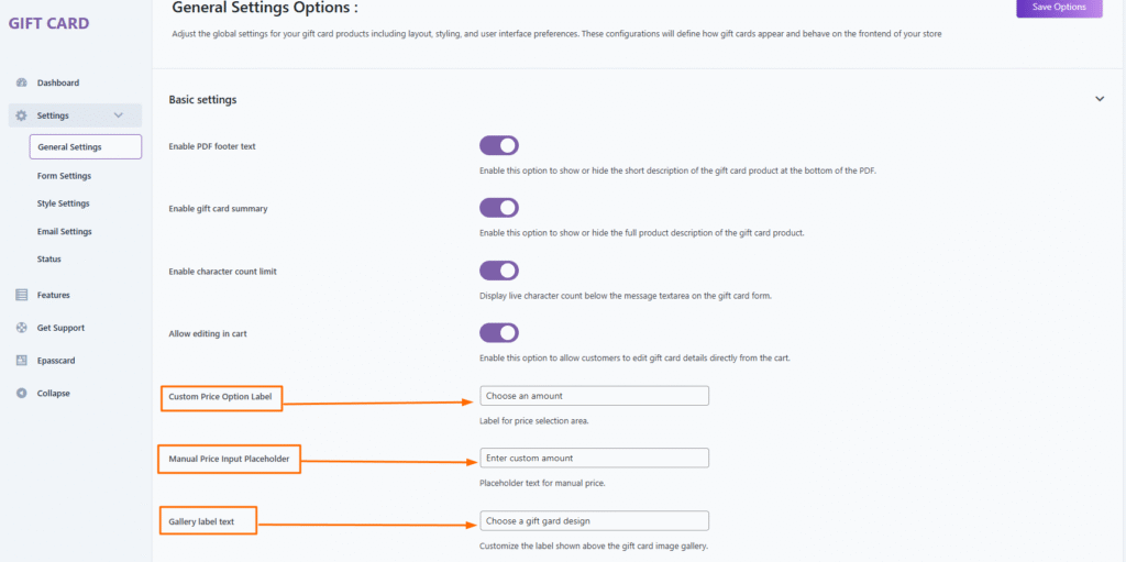The Basic Settings panel allows you to customize the visual appearance and behavior of your gift cards. Each option helps personalize the gift card experience for both the sender and receiver.