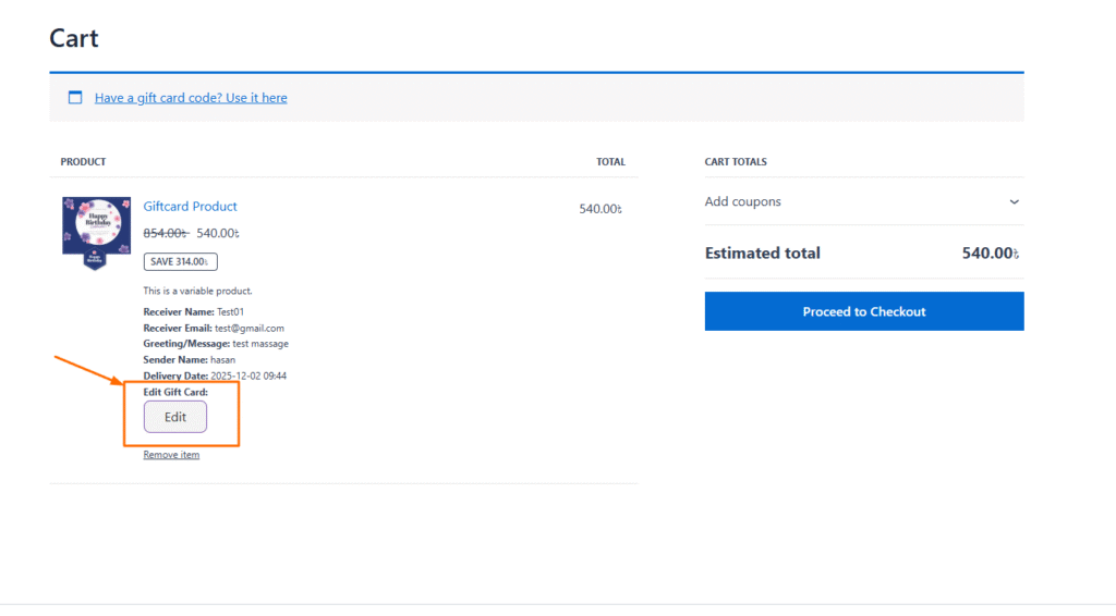 The checkout page will display an “Edit” button, enabling customers to update any gift card information (sender details, receiver details, message, amount, image, etc.) before placing the order.