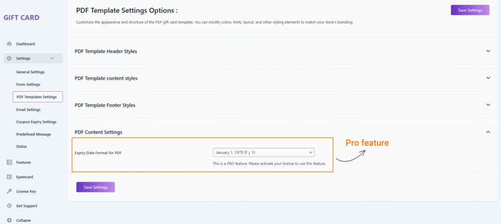 Choose the format in which the gift card expiry date will appear on the generated PDF.