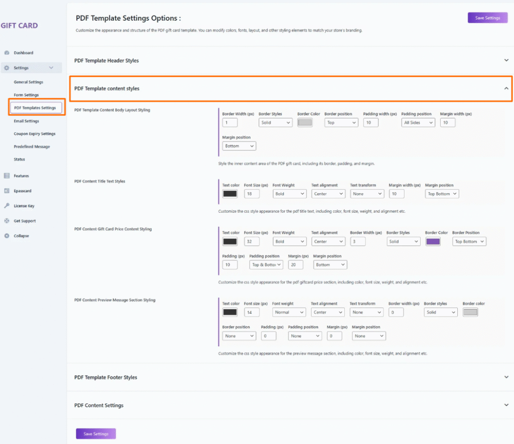 Configure the styling of the header image area inside the PDF—where your gift card image or banner is displayed.