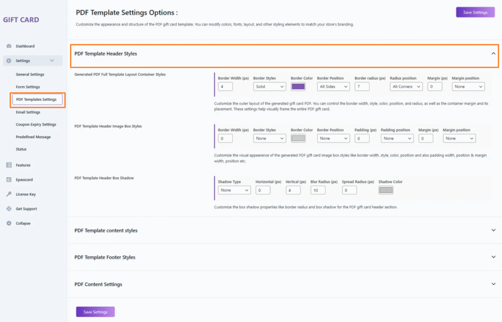 These settings allow you to customize the visual layout, container styling, image area, and shadow effects of the header section in the generated PDF gift card.
