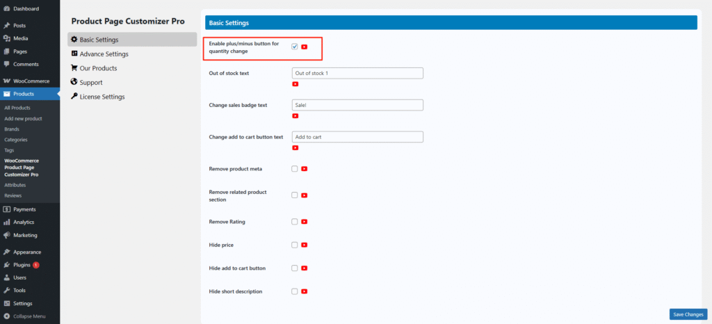 WooCommerce does not provide plus and minus buttons to easily increase or decrease the quantity of a product, which can create hassle for customers. To make this process smoother, the Single Product Page Customizer plugin offers an option to enable Plus/Minus buttons for the quantity field.