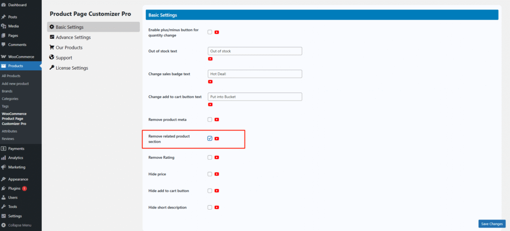 To solve this, the Single Product Page Customizer plugin offers a simple solution. Just check the “Remove Related Product Section” option in the settings, and the related products will no longer appear.