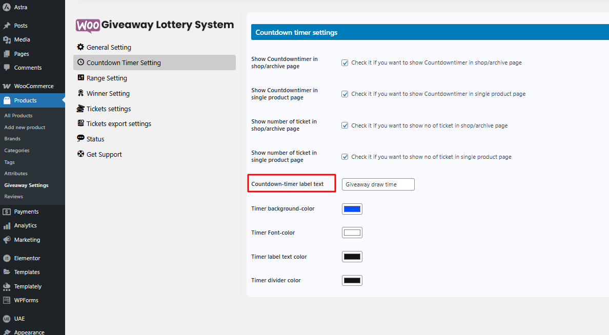 Home » WooCommerce Giveaway Lottery Documentation » Countdown timer settings » How to setup Countdown timer Label text » image