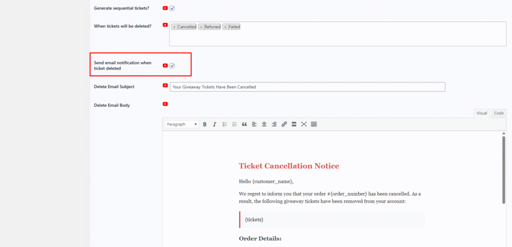 If the order is later cancelled, refunded, or marked as failed, the associated tickets are automatically deleted (based on admin settings). At that moment, the customer will receive an email notification informing them that their tickets have been removed.