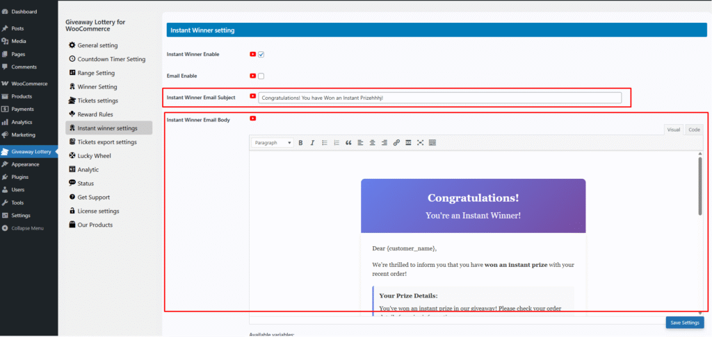 - Locate and enable the option: “Instant Winner Enable”.