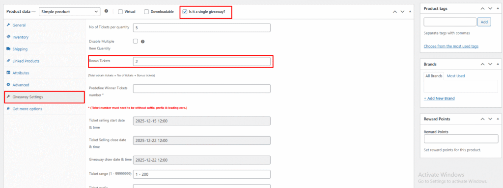 Giveaway Lottery for WooCommerce allows you to offer bonus tickets for your giveaway products. You can easily set up bonus tickets directly from the Edit Product page by defining the exact quantity of bonus tickets.