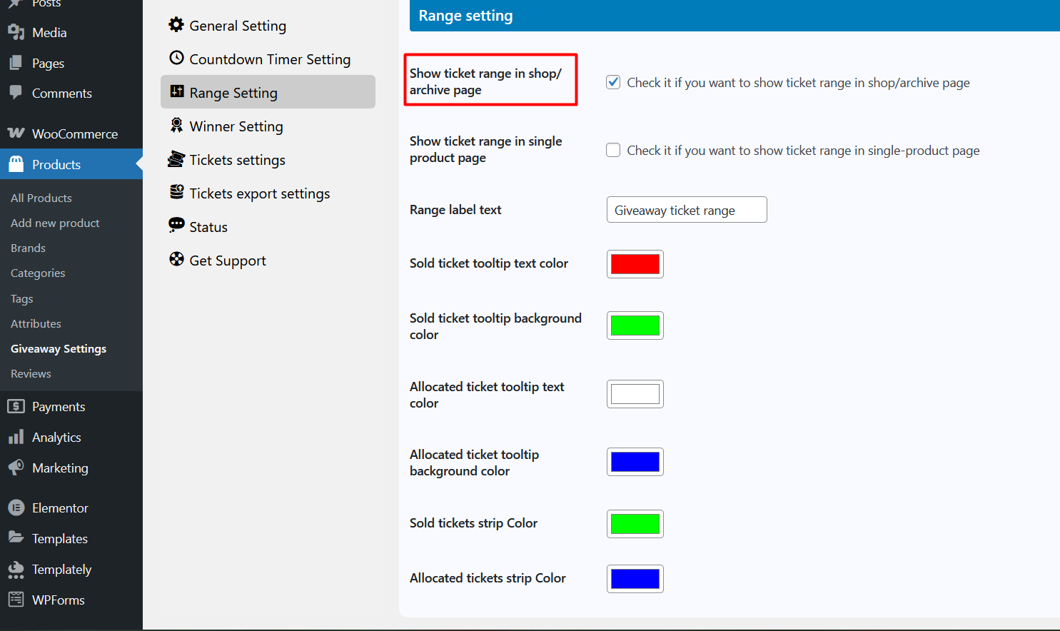 Home » WooCommerce Giveaway Lottery Documentation » Tickets range settings » Enable Ticket Range Display on Shop Page for Giveaways » image